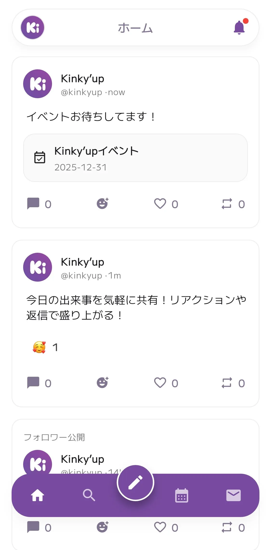 Kinky'upは、投稿・DM・イベントを繋げるシンプルなアプリです。